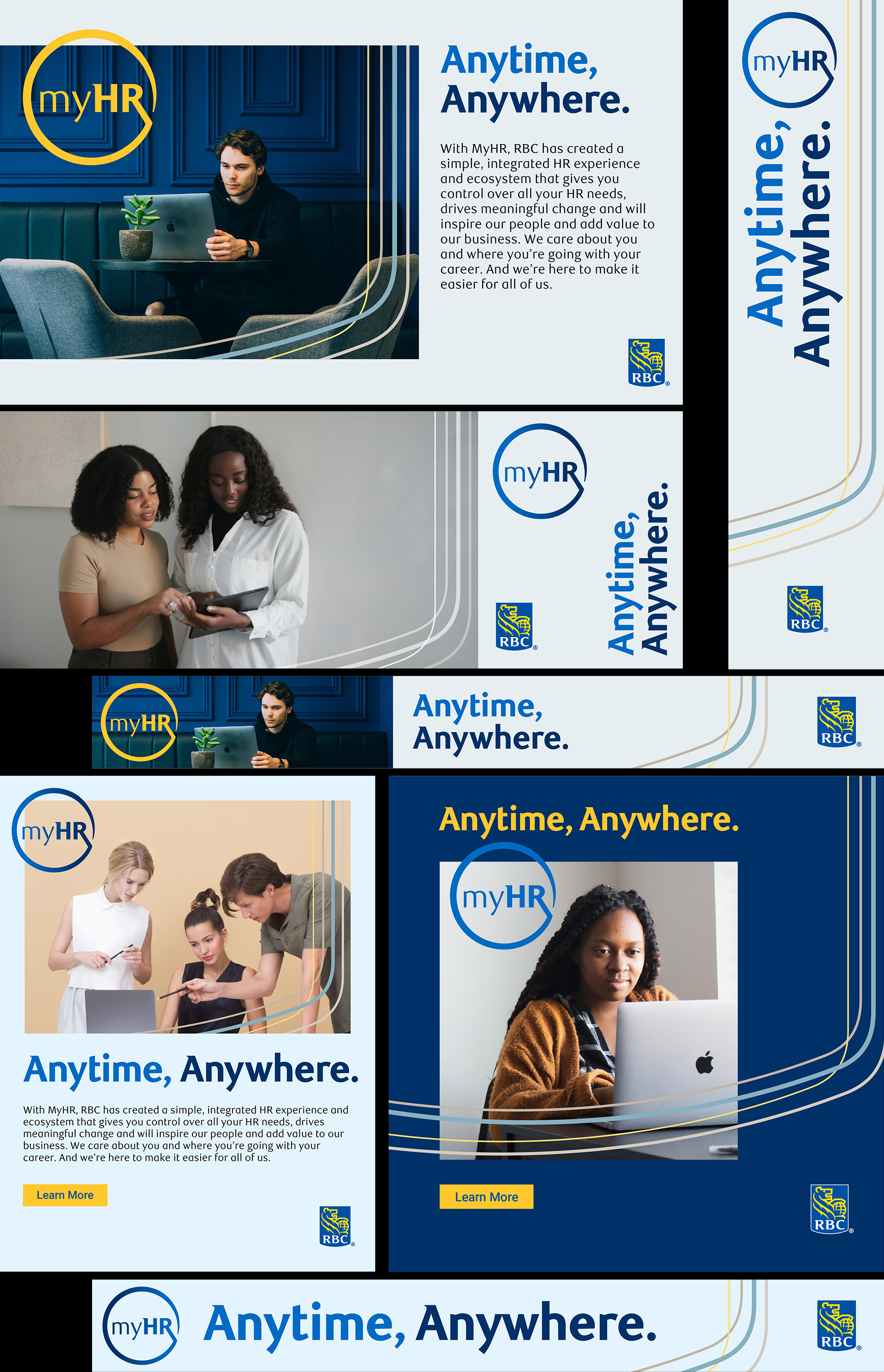 We updated the brand for RBC's HR department called myHR. I designed a new logo and various digital layouts for the update using RBC's brand colors and font.