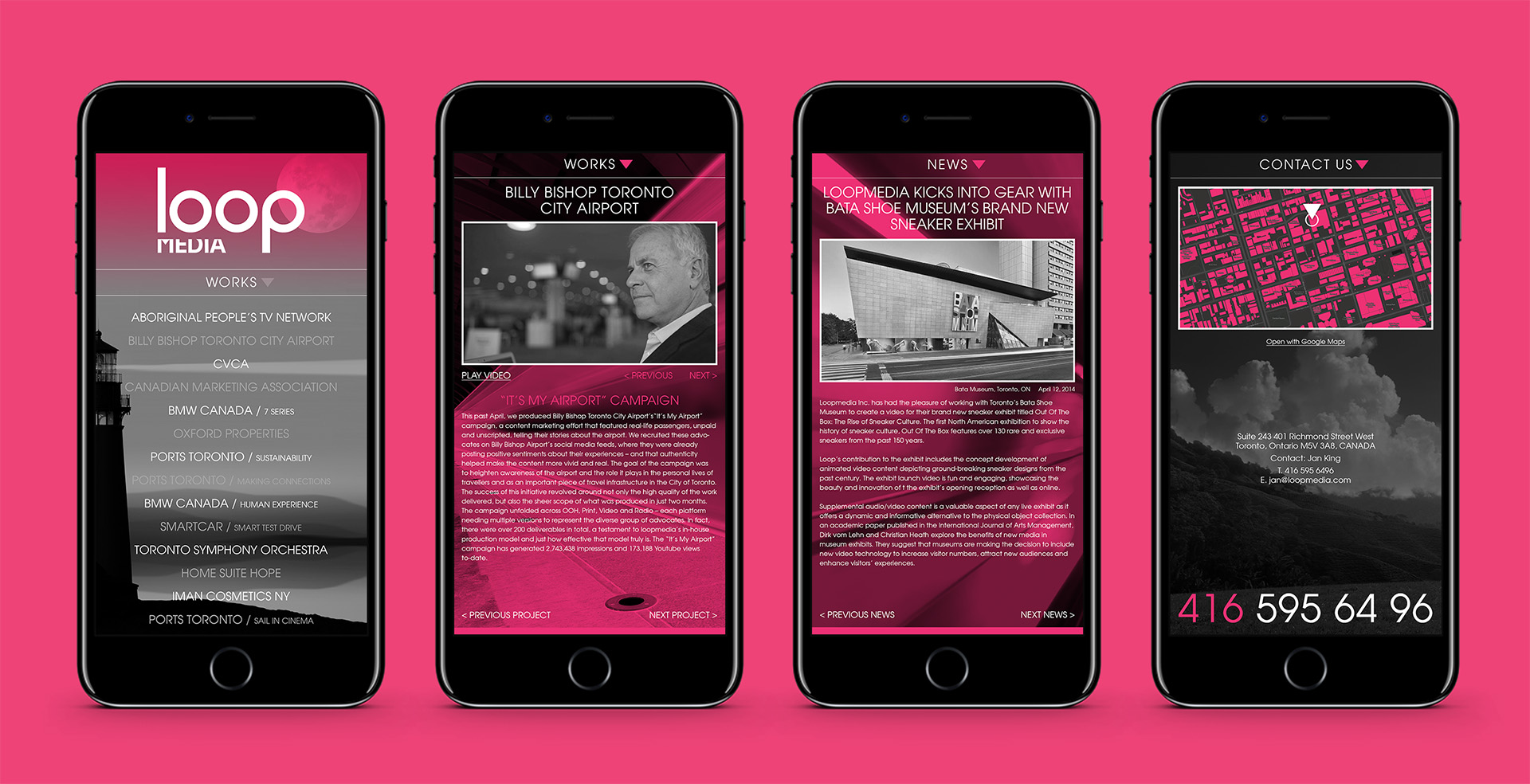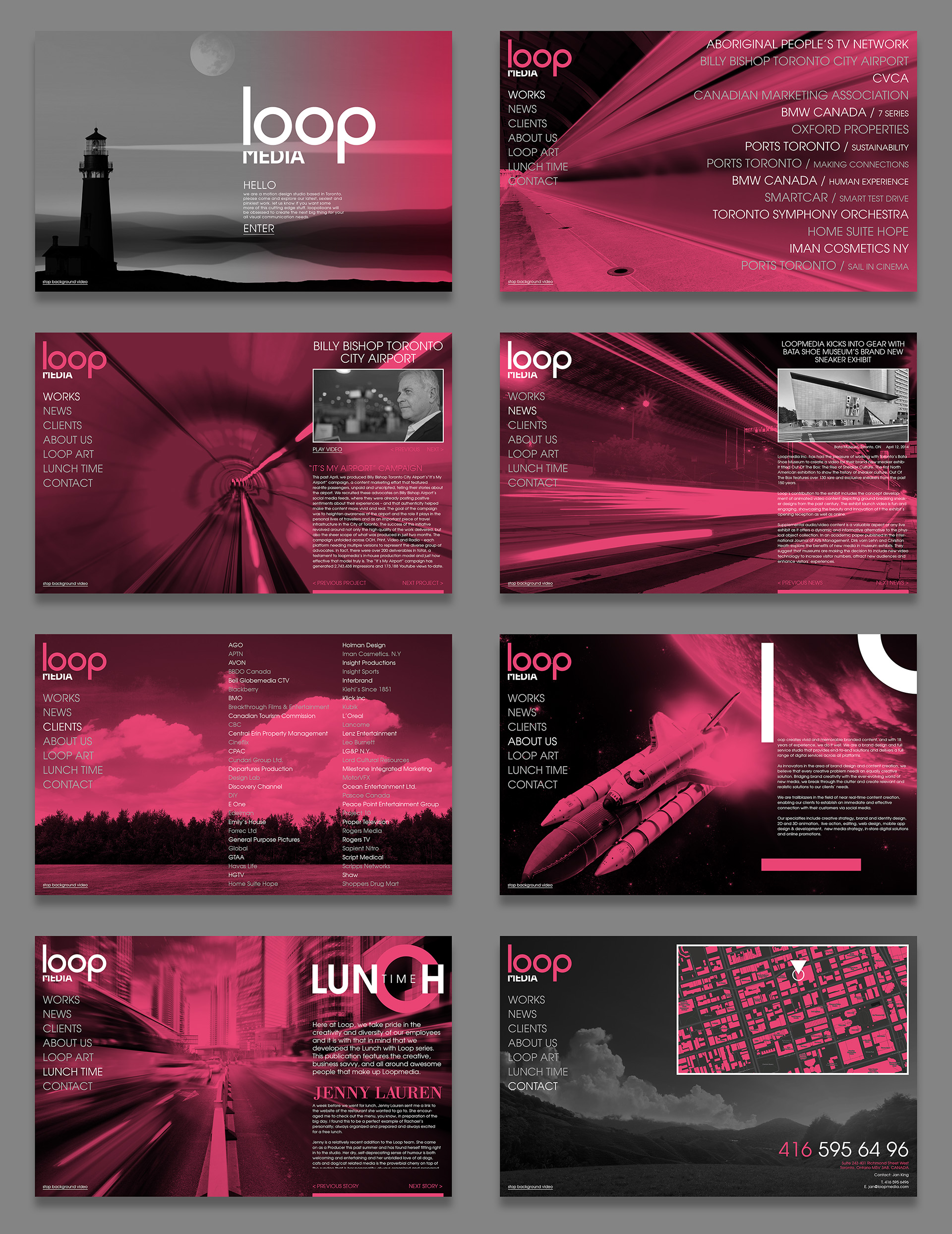 I worked on the new branding and website of the motion design studio Loop Media based in Toronto. I also hand-coded their website using advanced techniques like utilising the Vimeo API to pull video content automatically and the Mapbox API for the live maps on contact page.